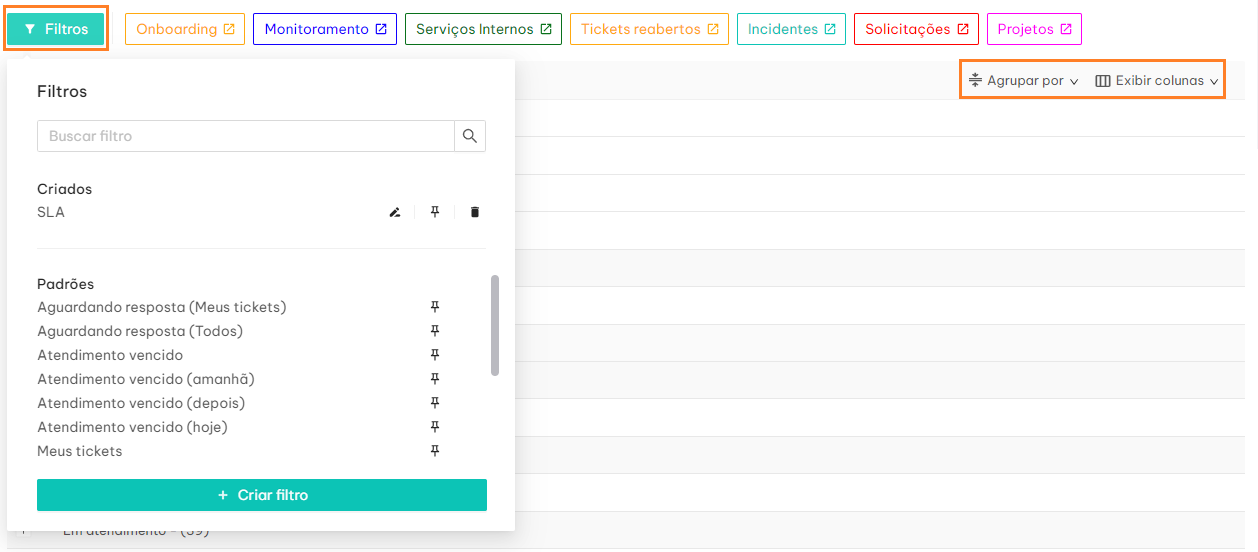 AlĆ©m disso, reposicionamos as funcionalidades de āFiltrosā, āAgrupar porā e āExibir colunaā.