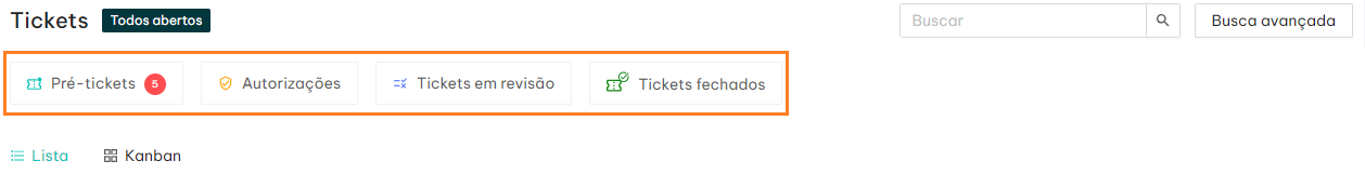 Cabeçalho da tela de tickets: Criamos atalhos para que as informações de pré-tickets, tickets fechados, tickets em revisão e autorizações fiquem mais evidentes e intuitivos.