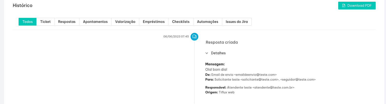 **Informação de quem enviou e recebeu a comunicação**: adicionadas informações sobre quem recebeu e quem enviou a comunicação, as novas informações podem ser consultadas no histórico do ticket.