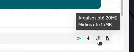 **Melhoria no tooltip de anexar arquivos no chat**: alterada explicação dos tooltips de anexar arquivos em chats, tamanho máximo dos arquivos passou de 15MB para 20MB e mídias até 15MB.