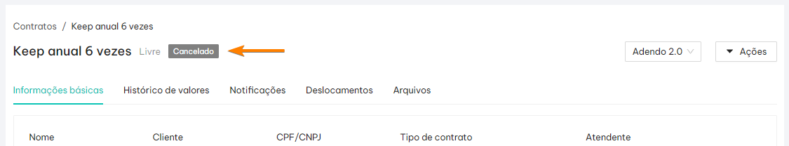 **Contrato inativo com tag de ativo**: ajustada tag de contratos cancelados, ao cancelar um contrato aparecerá a tag “Cancelado” ao lado do nome do contrato e após passar pela data de cancelamento a tag será exibida como “inativo”.