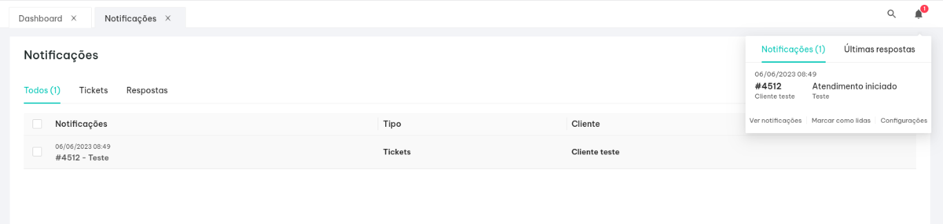 **Notificações para usuários do tipo cliente**: adicionada notificação para usuários do tipo cliente, a notificação será de “Atendimento iniciado” e será enviada para o usuário quando um dos tickets abertos por ele for assumido pelo atendente.