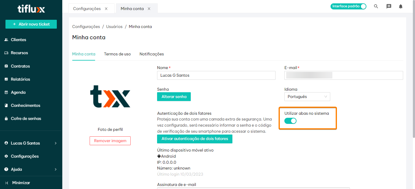 **Desativar as abas no sistema**: Adicionada a possibilidade de habilitar ou desabilitar as abas no sistema, opção ficou localizada nas configurações de “Minha conta” e por padrão ela vem ativada.