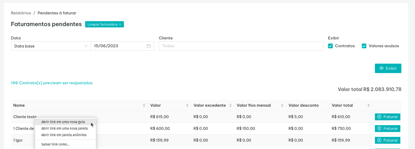 **Relatório de faturamentos pendentes**: Liberada a abertura de faturamentos pendentes em nova aba do navegador, ao clicar com o botão direito do mouse ou com o scroll em faturamentos exibidos no relatório será possível abrir os faturamentos listados em nova aba.
