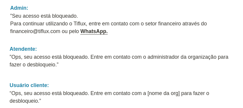 **Mensagem de inadimplência**: Alterada a mensagem para os usuários de organizações inadimplentes, cada tipo de usuário terá uma mensagem diferente.