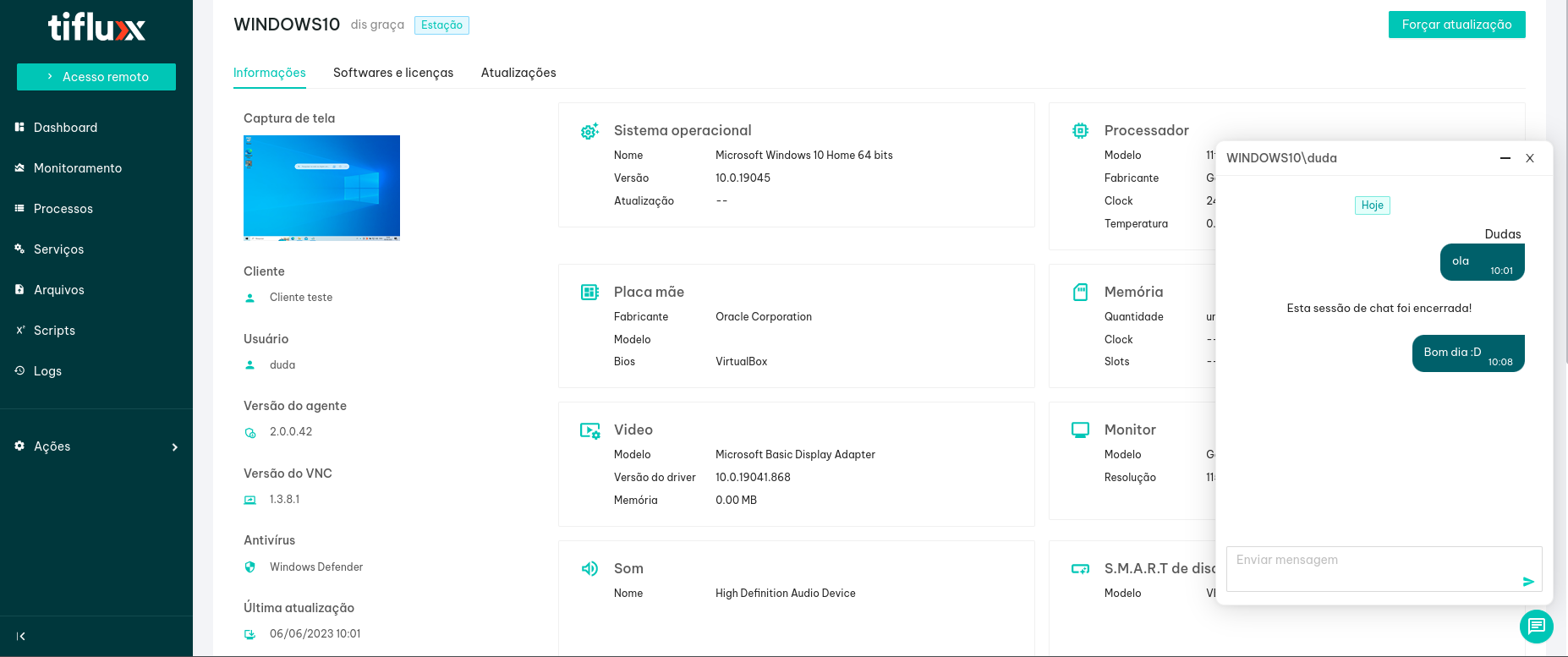 **Chat no agente remoto:** Reescrevemos a conexão de chat do agente remoto para a nova interface, o novo chat pode ser iniciado clicando no ícone cinza no canto inferior direito. Quando houver um chat em andamento o ícone do chat vai ficar azul e se houverem mensagens não lidas terá um contador.