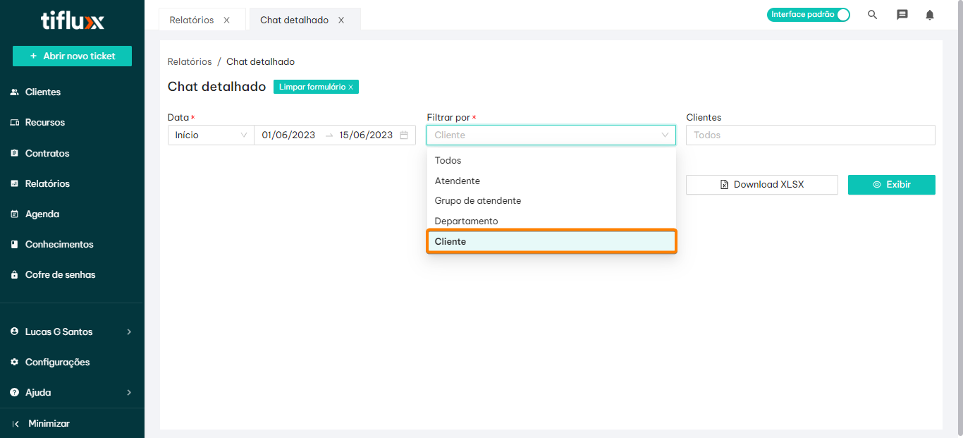 **Novo filtro no relatório de chat detalhado**: adicionado filtro de “Clientes” no relatório de chat detalhado, o filtro é aplicado ao relatório XLSX e a visualização do relatório em tela.