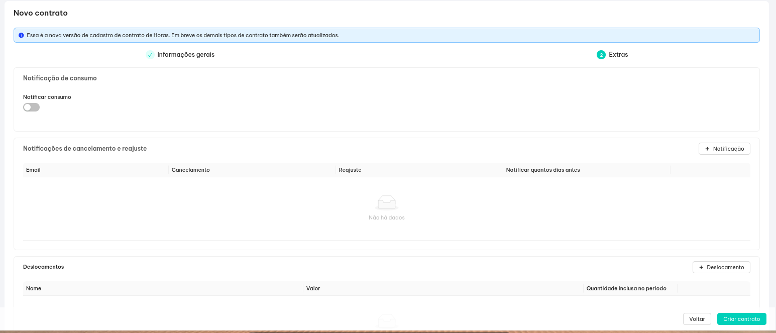 A nova estrutura reduz o processo para apenas duas etapas: Informações Gerais e Extras, facilitando a revisão e a criação de contratos. Além disso, adicionamos um resumo de valores com descontos aplicados. Essas mudanças otimizam o processo e garantem uma experiência mais fluida para os usuários.
